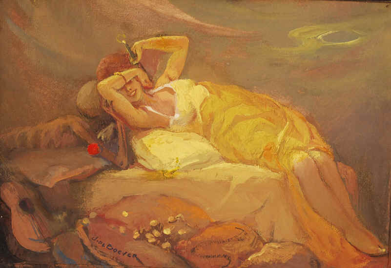 Most of De Boever's paintings are of literary and allegorical/mythological subjects that reflect romantic imagery, depicting the constant universal struggle of good vs. evil. Many of these subjects are symbolically illustrated as beautiful art nouveau women (good), interacting with skeletons, demons or gargoyles (evil).